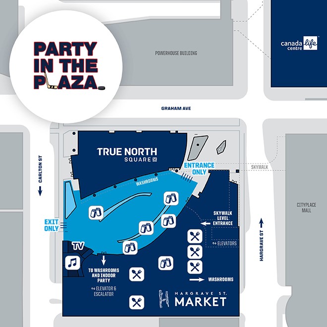 Entrances will be at the corner of Carlton and Hargrave and via the Skywalk entrance to Hargrave St. Market. Fans entering Hargrave St. Market through the True North Square parkade will use the east side elevators. West side elevators will be closed.